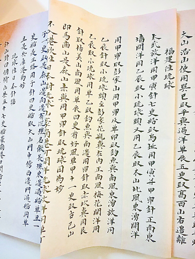 《順風相送》是一部航海指南,共127則,主要記錄了關于氣象方面的觀察方法、州府山形水勢、前往各地的航程等。其中“福建往琉球”一則記載了福建到琉球的海路,第一次出現了“釣魚嶼”(即釣魚島)、“赤坎嶼”(即赤尾嶼)的名稱。書中有關原文如下: